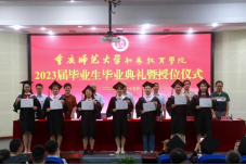 奏唱中華人民共和國國歌后,本次畢業(yè)典禮正式開始。學院院長郝明君宣讀重慶師范大學2023屆優(yōu)秀畢業(yè)生表彰決定,學院共有123名同學獲評“優(yōu)秀本科畢業(yè)生”。隨后參會領導為優(yōu)秀畢業(yè)生代表頒發(fā)了榮譽證書。