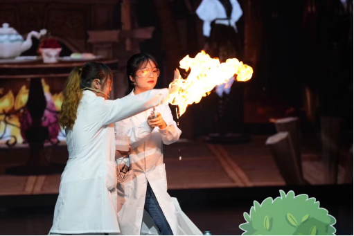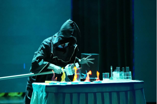 《自然魔術(shù)師——風(fēng)火雷電》是由我院林長(zhǎng)春、鐘紹波、陳放等教師指導(dǎo)白雅鷺、楊伊、朱鴻梅等10名科學(xué)教育研究生、本科生科普志愿者傾力打造的科普實(shí)驗(yàn)秀節(jié)目。節(jié)目利用空氣動(dòng)力原理的“空氣炮”、金屬電子躍遷現(xiàn)象產(chǎn)生的“焰色反應(yīng)”、丁烷燃燒產(chǎn)生的“火焰掌”以及特斯拉電圈、靜電屏蔽等科學(xué)實(shí)驗(yàn)讓現(xiàn)場(chǎng)觀眾驚嘆連連,掌聲雷動(dòng)。跌宕起伏的劇情、高潮迭起的畫面、活潑有趣的故事情節(jié)引人入勝,大家仿佛身臨其境地跟隨主人公一起,完成了拯救森林的任務(wù)。