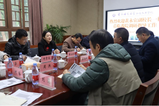 11月26日下午,學(xué)校黨委常委、副校長(zhǎng)黃永宜帶領(lǐng)黨政辦、基建處、后資處、財(cái)務(wù)處、國(guó)內(nèi)合作與聯(lián)絡(luò)中心、發(fā)規(guī)處等職能部門(mén)負(fù)責(zé)人及相關(guān)人員到北碚校區(qū)調(diào)研“一校三區(qū)”聯(lián)動(dòng)工作,檢查指導(dǎo)初等教育學(xué)院各項(xiàng)工作推進(jìn)情況。學(xué)院黨政領(lǐng)導(dǎo)班子及相關(guān)科室負(fù)責(zé)人陪同調(diào)研。