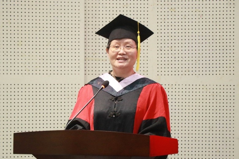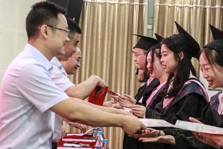 隨后,典禮進行2022屆畢業(yè)生授位儀式。學(xué)院副院長蒲淑萍教授宣讀2022屆畢業(yè)生授位決定,學(xué)院學(xué)位評定委員會主席、院長郝明君教授為獲得授位資格的畢業(yè)生逐一授位。