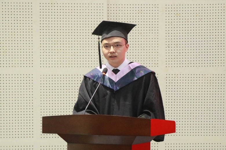 畢業(yè)年級學(xué)生代表2018級科學(xué)教育專業(yè)馬預(yù)龍同學(xué)代表全體畢業(yè)生對初等教育學(xué)院全體教師、后勤工作人員等的關(guān)心和幫助表示感謝,帶領(lǐng)同學(xué)們回憶過去,又憧憬未來,并向?qū)W院和老師們表達美好的祝愿。