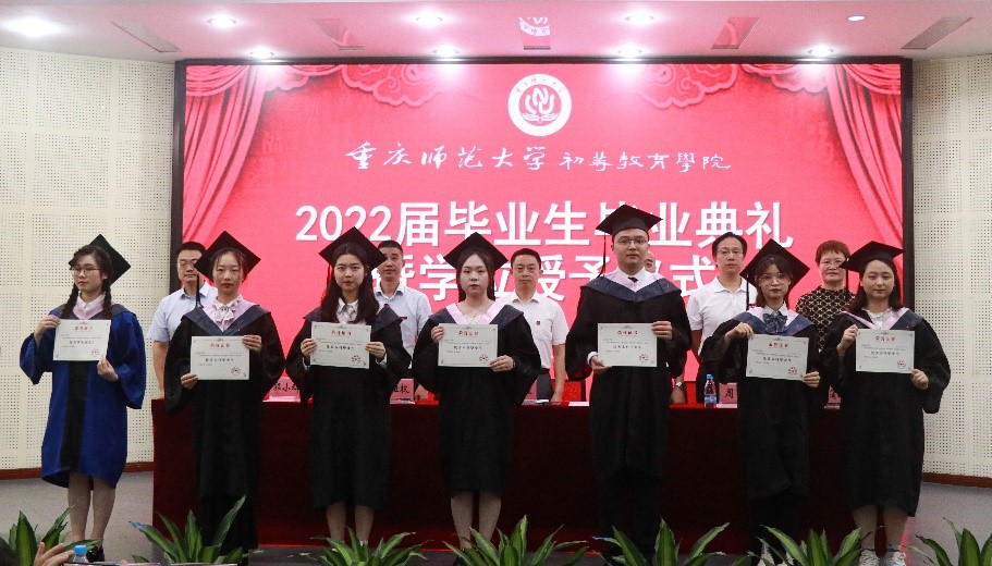 在高亢激昂的國歌聲中,畢業(yè)典禮拉開帷幕。校黨委常委、紀(jì)委書記、監(jiān)察專員肖應(yīng)紅教授宣讀重慶師范大學(xué)2022屆優(yōu)秀畢業(yè)生表彰決定,學(xué)院有93名同學(xué)獲評“優(yōu)秀本科畢業(yè)生”、4名同學(xué)獲評“優(yōu)秀研究生畢業(yè)生”。與會領(lǐng)導(dǎo)為優(yōu)秀畢業(yè)生代表頒發(fā)了榮譽證書。