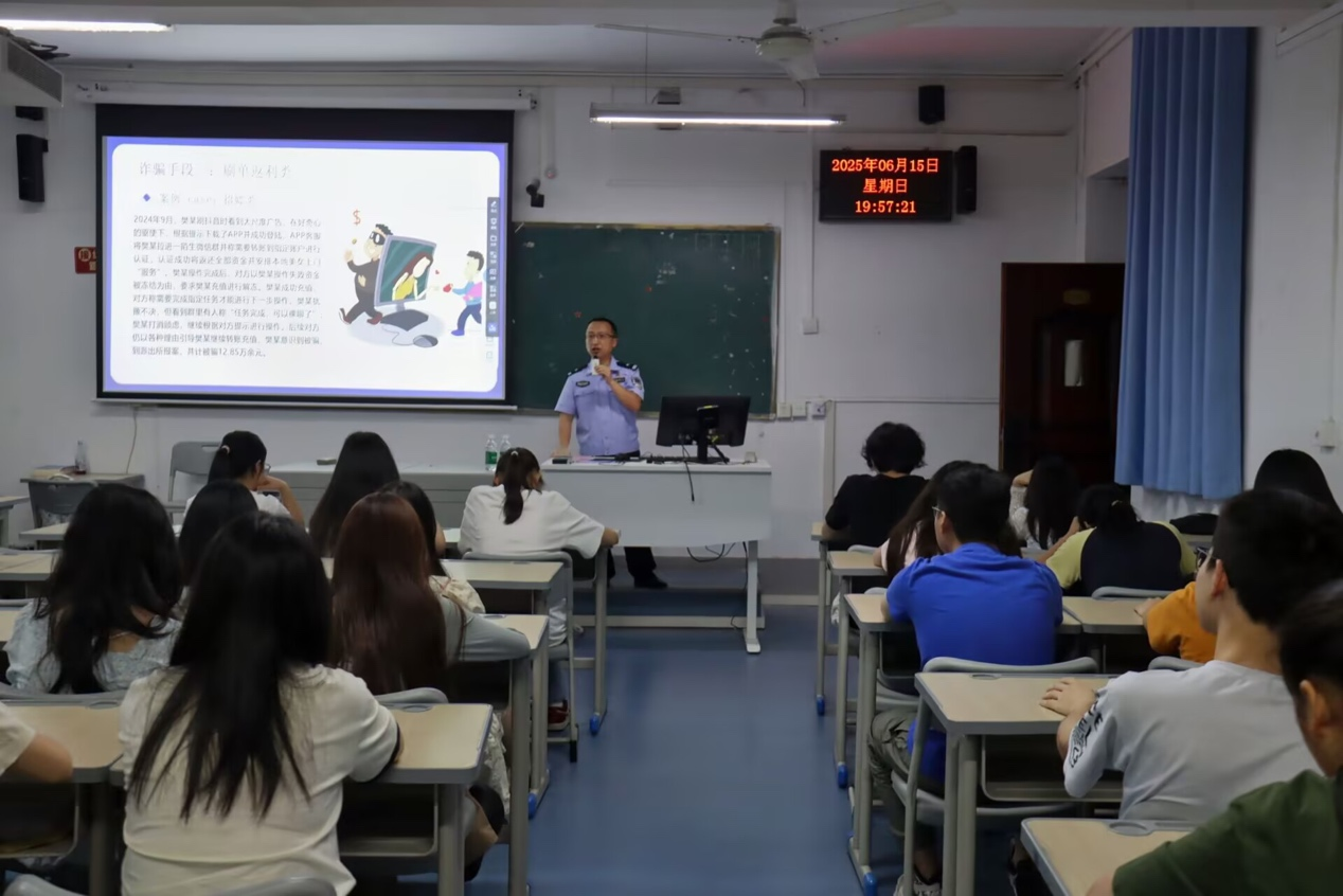 而后,李警官開始正式的專業(yè)講解,首先李警官向大家科普了電信網(wǎng)絡(luò)詐騙相關(guān)的基本知識(shí):闡明了電信網(wǎng)絡(luò)詐騙的概念、分析受騙的群體,并逐步深入受騙者的信任心理的形成過(guò)程。在此基礎(chǔ)上,李警官講到電信網(wǎng)絡(luò)詐騙的常用手段——這是本次宣講的重點(diǎn),也是識(shí)別詐騙以進(jìn)行反詐騙需要具備的重點(diǎn)知識(shí)。李警官提到的各類手段深刻而經(jīng)典,涵蓋刷單返利、虛假購(gòu)物、投資理財(cái)?shù)榷鄠€(gè)方面,并在這過(guò)程中始終以同學(xué)們實(shí)際的日常生活為根本,把繁雜的反詐騙知識(shí)融于同學(xué)們可聽可感的經(jīng)驗(yàn)與案例中,力求將同學(xué)們的反詐知識(shí)進(jìn)行實(shí)際應(yīng)用轉(zhuǎn)化,如暑假遇到的兼職刷單信息與演唱會(huì)賣票情形,使反詐騙知識(shí)真正落地生根,為同學(xué)們反詐提供難能可貴的指導(dǎo)與保障。