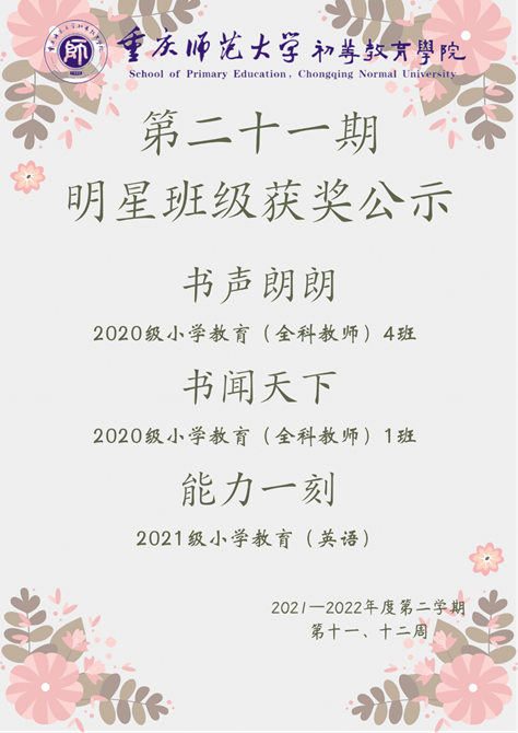 為推進(jìn)學(xué)院學(xué)風(fēng)建設(shè),使同學(xué)們養(yǎng)成良好的學(xué)習(xí)習(xí)慣,營造濃厚的讀書與學(xué)習(xí)氛圍,提升同學(xué)們的個人素養(yǎng),在第二十一期明星班級評選活動中,初等教育學(xué)院對以下表現(xiàn)優(yōu)異的班級給予表彰: