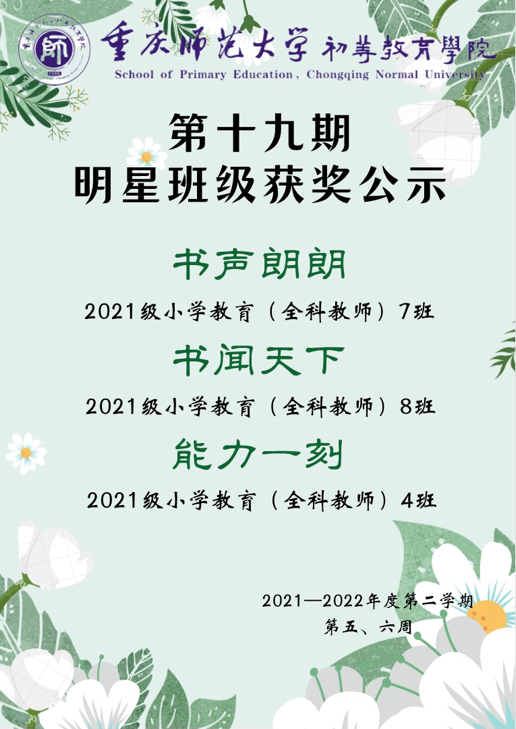 為在學(xué)院營造良好的學(xué)習(xí)氛圍,增添校園活力,鼓勵(lì)同學(xué)們樹立優(yōu)良作風(fēng),提高綜合素質(zhì),重慶師范大學(xué)初等教育學(xué)院在第十九期”明星班級(jí)“評(píng)選活動(dòng)中,對(duì)以下班級(jí)予以表彰: