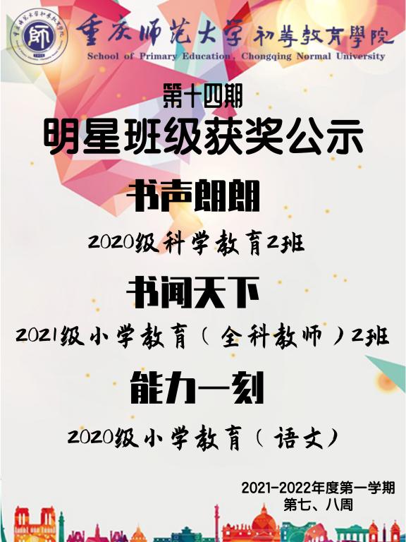 為了營造積極向上的校園學(xué)習(xí)氛圍,提升各個班級的凝聚力,增強(qiáng)同學(xué)們的集體榮譽(yù)感,展現(xiàn)大學(xué)生的青春風(fēng)采。在第十四期“明星班級”評選活動中,初等教育學(xué)院特對以下表現(xiàn)優(yōu)異的班級提出表彰: