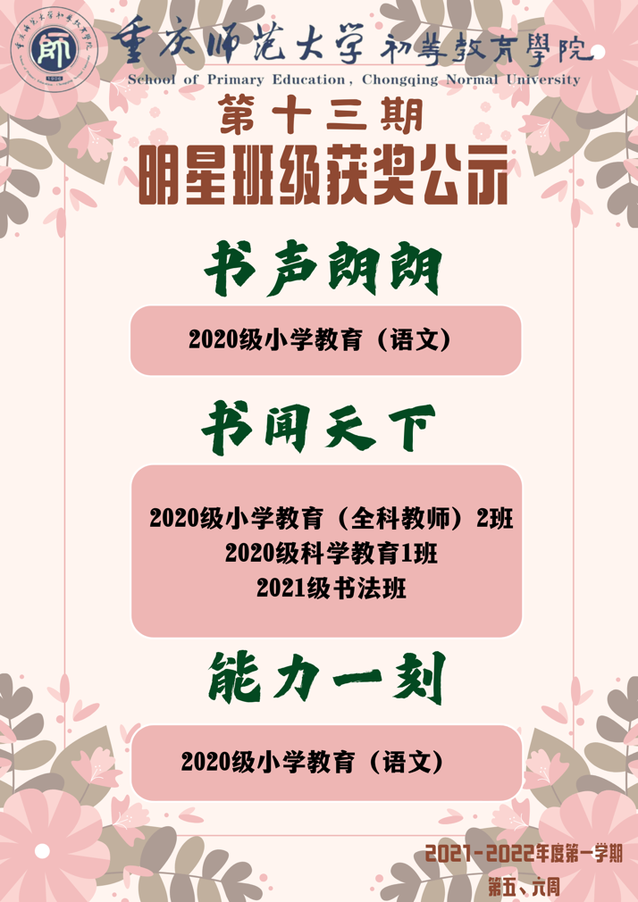 新生老生各展風(fēng)采,朝聞朗朗書聲,日有攜書而行,且看能力展示。在第十三期“明星班級(jí)”評(píng)選活動(dòng)中,為鼓勵(lì)各班級(jí)再接再厲,營(yíng)造學(xué)院良好氛圍,初等教育學(xué)院特對(duì)以下優(yōu)秀班級(jí)提出表彰: