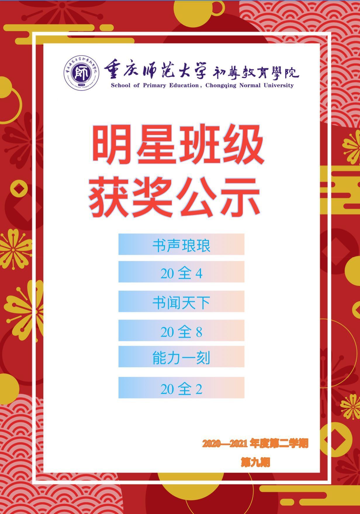 于此鐘靈毓秀之地,書(shū)聲瑯瑯。為激勵(lì)莘莘學(xué)子加強(qiáng)學(xué)風(fēng)建設(shè),打好基礎(chǔ),營(yíng)造濃厚的學(xué)習(xí)氛圍,展現(xiàn)大學(xué)生的青春活力,弘揚(yáng)刻苦學(xué)習(xí)的精神。重慶師范大學(xué)初等教育學(xué)院在第九期“明星班級(jí)”評(píng)選活動(dòng)中對(duì)以下班級(jí)予以表彰: