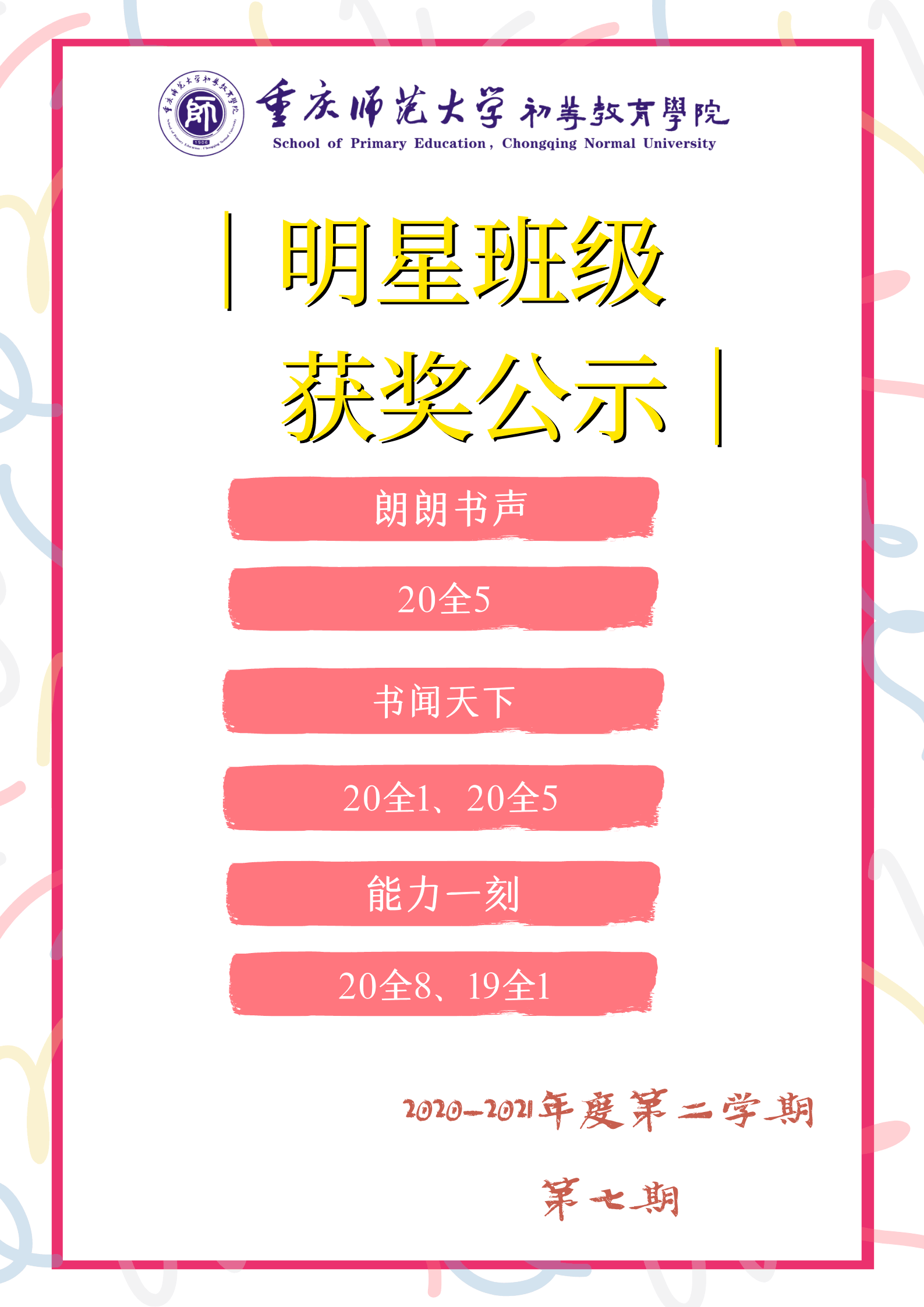 為了促進(jìn)同學(xué)們更好地進(jìn)行早晚自習(xí),發(fā)揚(yáng)初教院一日三練的優(yōu)良傳統(tǒng),激勵廣大同學(xué)努力學(xué)習(xí)、奮發(fā)向上,重慶師范大學(xué)初等教育學(xué)院特舉辦明星班級評選活動。現(xiàn)公布第七期“明星班級”獲獎名單: