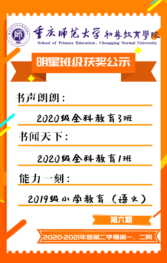 為增強對同學們的榜樣教育,培養(yǎng)同學們的綜合能力,激發(fā)同學們勇于爭先的進取精神,在全院班級中創(chuàng)設(shè)積極向上的學習氛圍,形成良好學風,增強校園活力。重慶師范大學初等教育學院在第六期“明星班級”評選活動中,對以下班級給予表彰: