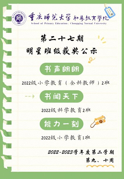 為營(yíng)造學(xué)院的學(xué)習(xí)氛圍,培養(yǎng)同學(xué)們良好的學(xué)習(xí)習(xí)慣,提高同學(xué)們的專(zhuān)業(yè)素養(yǎng),在第二十七期明星班級(jí)評(píng)選活動(dòng)中,部分班級(jí)表現(xiàn)突出,初等教育學(xué)院對(duì)以下班級(jí)提出表彰: