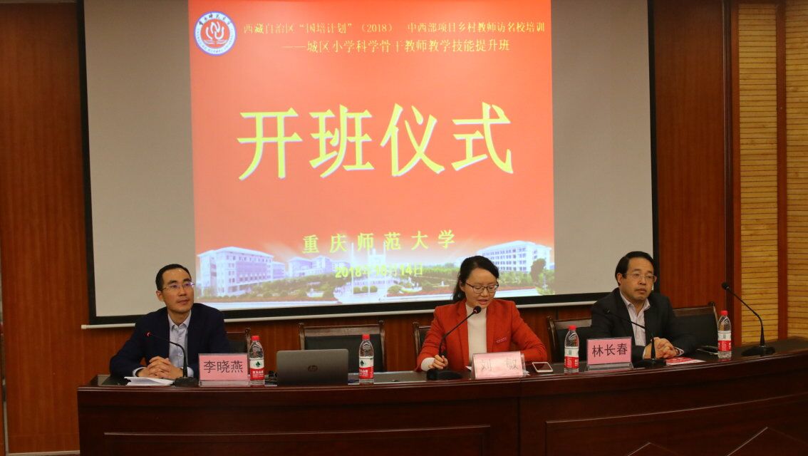 2018年10月13日上午8:30,由重慶師范大學初等教育學院承辦的西藏自治區(qū)“國培計劃”(2018)中西部項目——鄉(xiāng)村教師訪名校培訓城區(qū)小學科學骨干教師教學技能提升培訓班在沙坪壩校區(qū)教師培訓中心5301教室隆重開班。重慶師范大學教師培訓學院培訓科科長劉敏、初等教育學院黨委書記李曉燕、初等教育學院院長及項目首席專家林長春教授出席了開班儀式,開班儀式由初等教育學院黨委書記李曉燕主持。