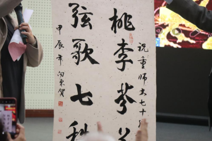 接著,離退休老同志們通過(guò)激情洋溢的節(jié)目表演,表達(dá)了歡樂(lè)愉快的心情和對(duì)學(xué)校、祖國(guó)的祝福。舞臺(tái)上的老同志們個(gè)個(gè)精神矍鑠,興致高昂。小合唱《夕陽(yáng)紅》在齊唱與輪唱轉(zhuǎn)換的美妙歌聲中展現(xiàn)出生活之美;口琴獨(dú)奏《我的祖國(guó)》,樂(lè)聲悠揚(yáng)婉轉(zhuǎn),空靈卻有力;獨(dú)唱《革命人永遠(yuǎn)是年輕》、詩(shī)歌朗誦《老年要自強(qiáng)》,小合唱《沒(méi)有共產(chǎn)黨就沒(méi)有新中國(guó)》、合誦《臨江仙》等,讓我們看見(jiàn)退休老同志對(duì)生活、對(duì)祖國(guó)的熱愛(ài)和力量;退休老師何光勇將為學(xué)校建校七十周年專(zhuān)門(mén)撰寫(xiě)的《重慶師范大學(xué)賦》、劉向東老師題寫(xiě)的書(shū)法作品《弦歌七秩,桃李芬芳》獻(xiàn)給母校。